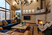 Гостиная в дачном доме с камином и мягкой мебелью